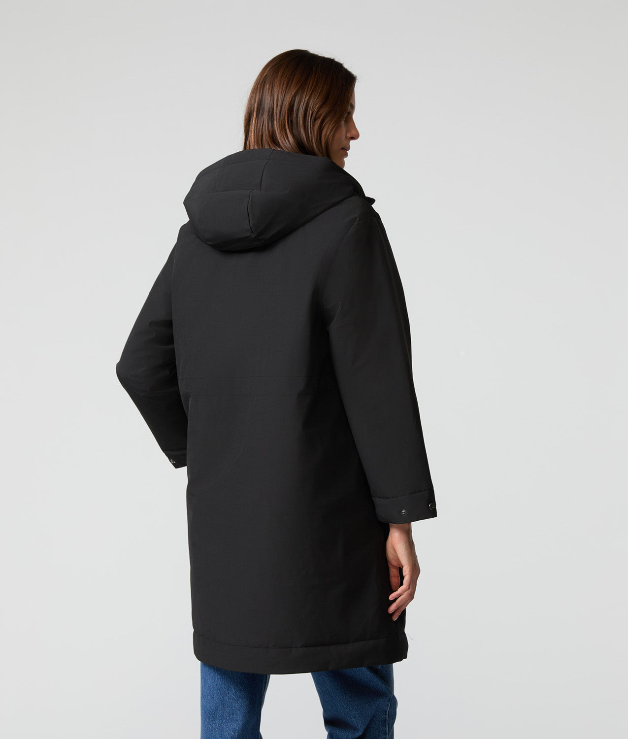 Damen-Winter-Parka in 3/4-Länge, der sich durch eine leicht lockere und ausgestellte Passform auszeichnet, die perfekt ist für diejenigen, die ein lineares und feminines Design suchen. Sie besteht aus einem 3-lagigen Außengewebe (3 Layer) mit einer regendichten Innenmembran, ist vollständig wasser- und winddicht und bietet somit einen hervorragenden Schutz vor der Witterung. Die Innenseite ist gefüttert und bereichert durch eine 100 % tierversuchsfreien RefrigiWear®-Thermo-Wattierung, die optimale Wärme und Komfort garantiert. Das Modell hat eine leicht übergroße Passform, mit einer verstellbaren regendichten Kapuze und einem Tunnelzug in der Taille für eine perfekte Anpassbarkeit. Ein vielseitiges und funktionales Kleidungsstück, das in Ihrer Wintergarderobe nicht fehlen darf. Ergänzen Sie Ihre Garderobe mit diesem Parka, um dem Winter mit Stil und Schutz zu begegnen.