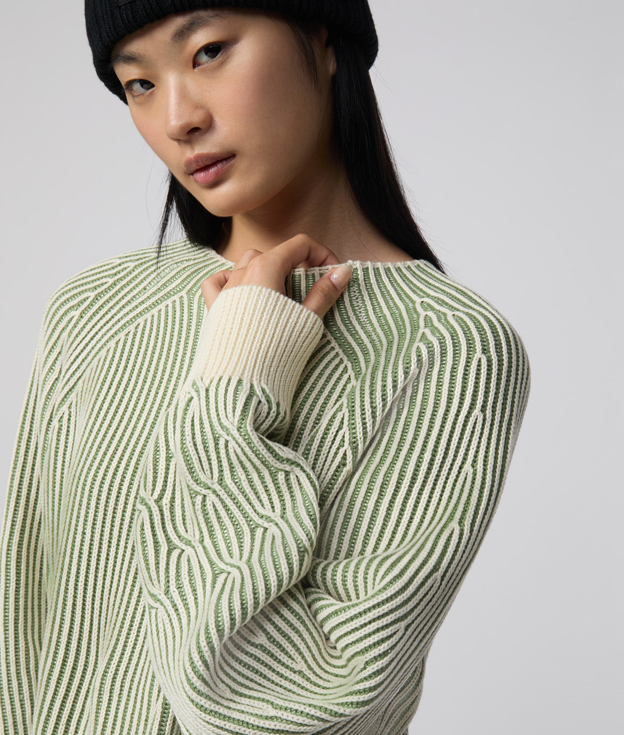 The Adele Knitwear is a women’s winter sweater with strong character, featuring bi-colour ribbed knitting and contrast tones. Cable-knit patterns on the sleeves and hem add structure and movement. The fit is cropped and slightly oversized for a comfortable yet defined look. Ribbed edges on the collar, cuffs, and hem ensure warmth and a perfect fit.