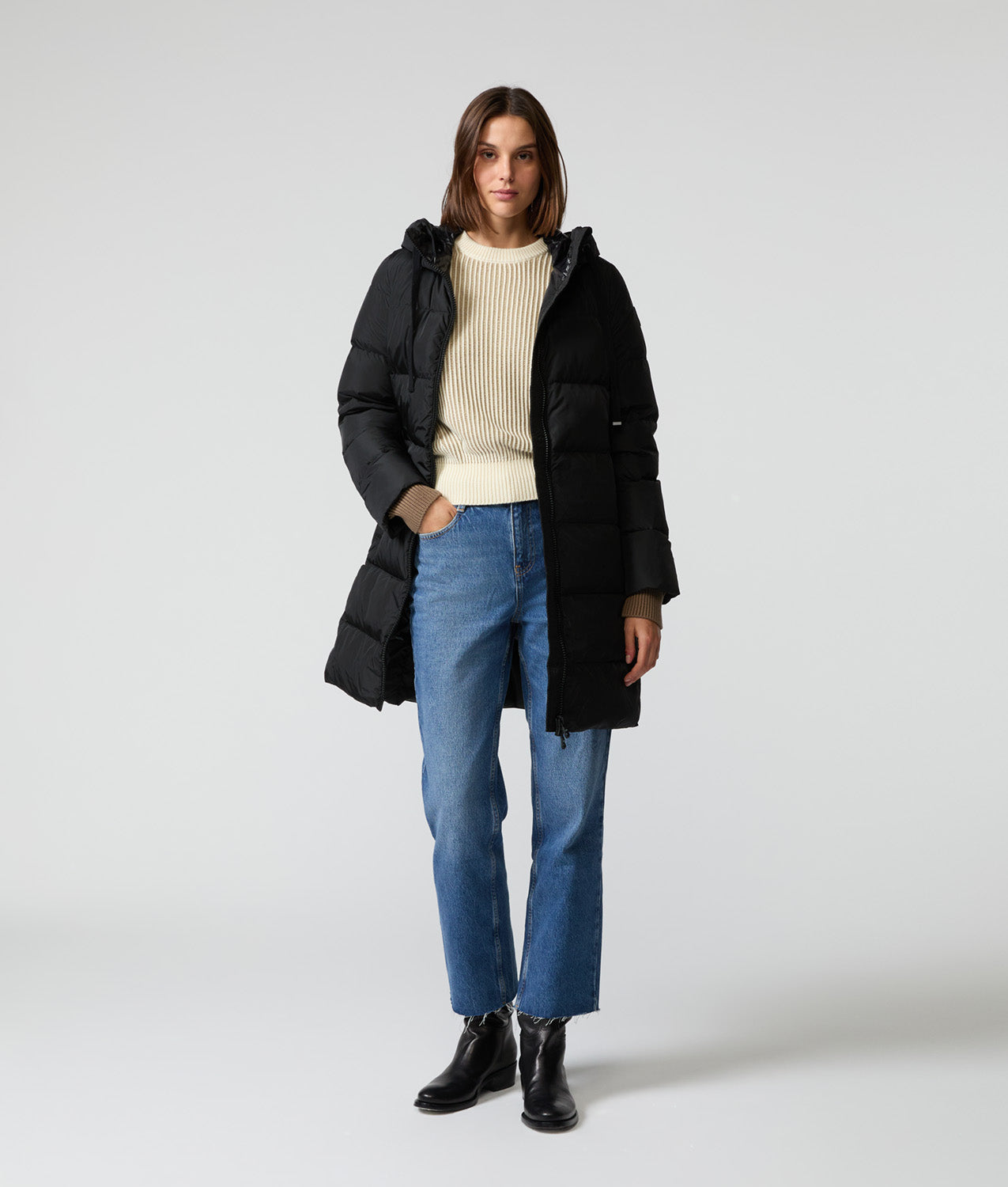 Women's 3/4-length winter down jacket that features a streamlined design and slightly loose fit, perfect for those seeking comfort and practicality. Filled with 100% down (90-10), it provides enveloping warmth and a pleasant feeling of comfort during the winter months. The exterior is made of satin nylon, which gives the garment a refined and elegant appearance. Add this down jacket to your winter wardrobe for a modern, functional look.