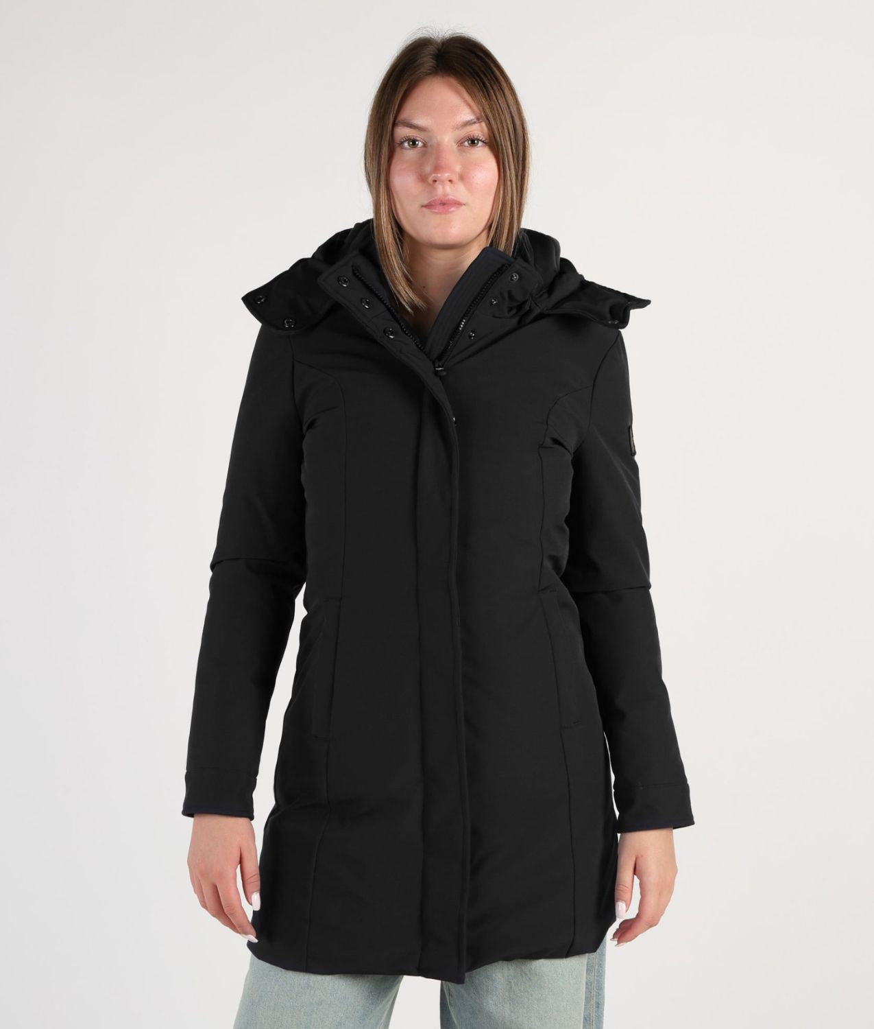 Women’s 3/4-length padded jacket designed to deliver absolute warmth and protection while maintaining a clean, lightweight and refined silhouette. Crafted from weather-resistant technical fabric and finished with a detachable hood featuring a removable eco-fur edge, it offers a sophisticated and functional winter look. Ideal for urban wear and everyday cold-weather conditions.