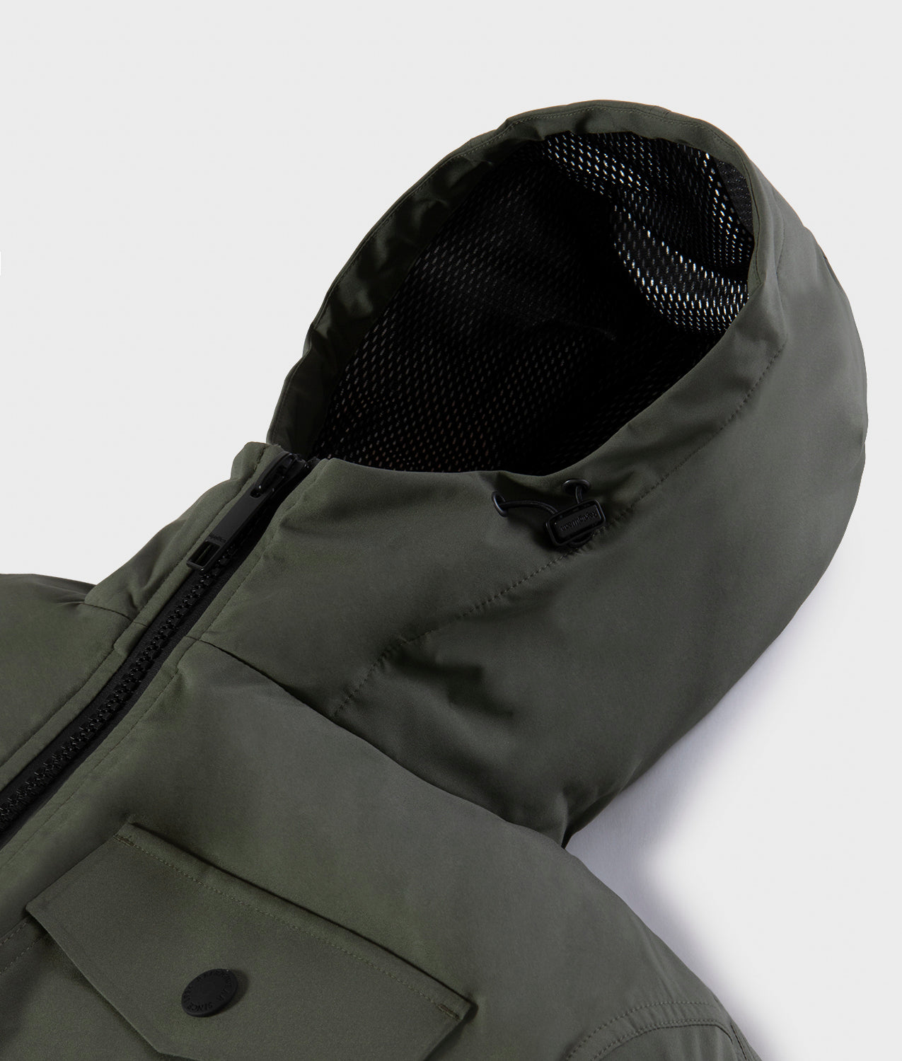 Hooded summer jacket in technical stretch soft-shell with a clean and contemporary look, designed for dynamic warm-weather use. Lightweight and breathable, it provides protection from wind and light rain while maintaining a refined silhouette. Ideal for those seeking functionality and style in a versatile everyday piece.