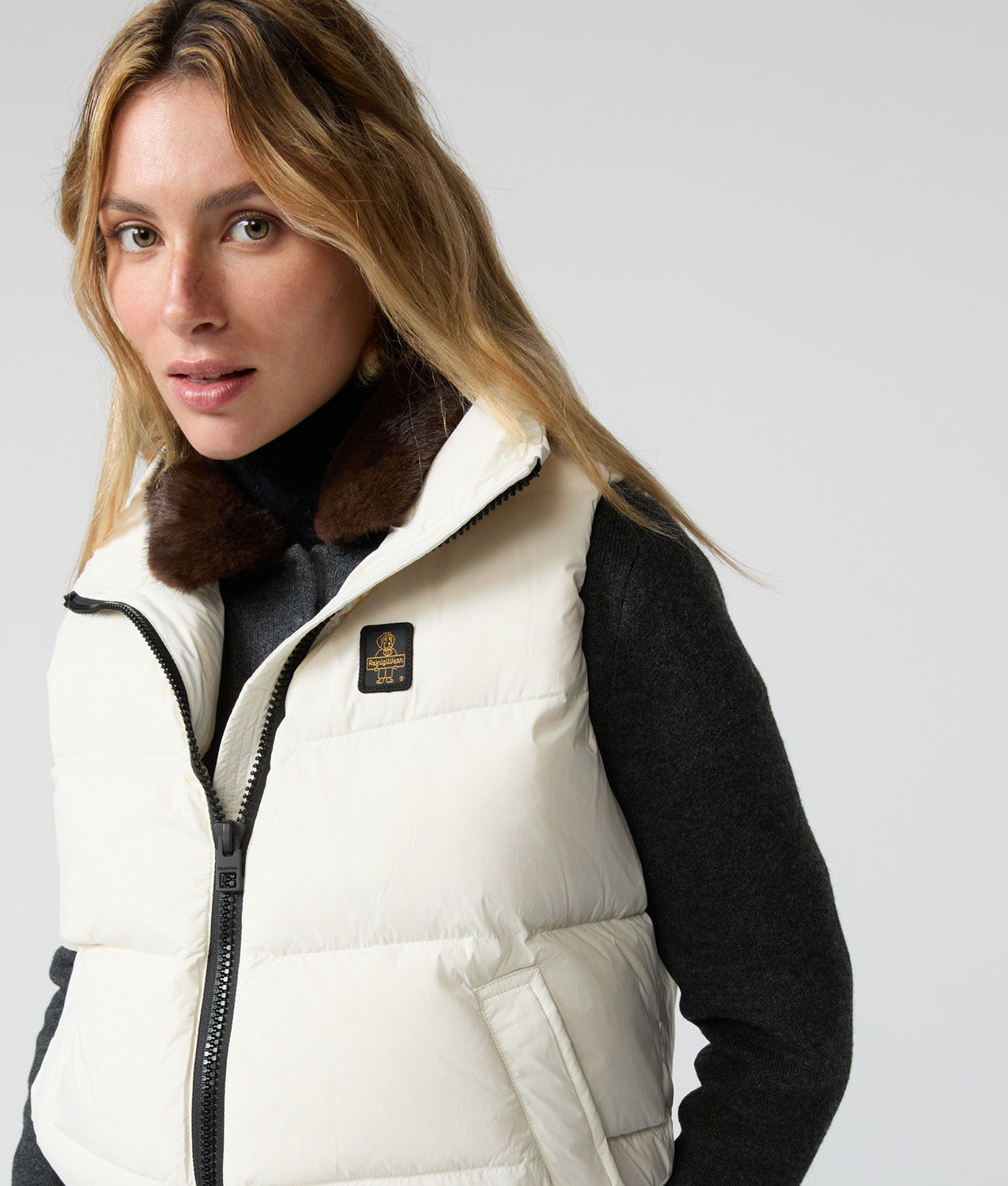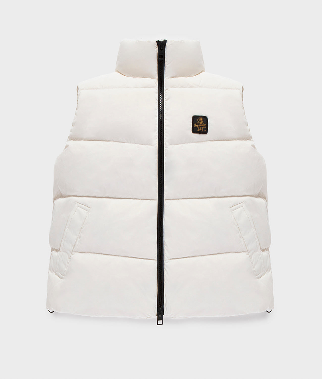Piumino smanicato da donna dal taglio crop e contemporano, con trapunta orizzontale ampia e un fit leggermente oversize. Il collo in piedi e lo stile essenziale lo rendono un capo incredibilmente trasversale. Realizzato in nylon ultra-light dall’aspetto opaco e soft touch, protegge da vento e agenti atmosferici. L’imbottitura è in 100% piuma 90-10 certificata RDS, che garantisce calore e protezione senza rinunciare alla leggerezza e praticità.