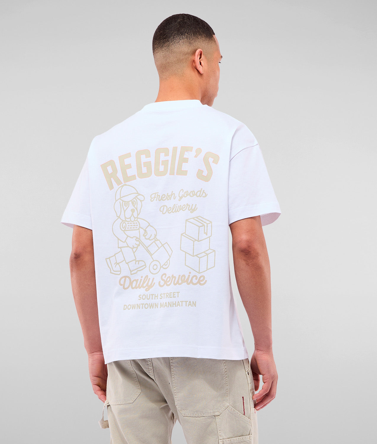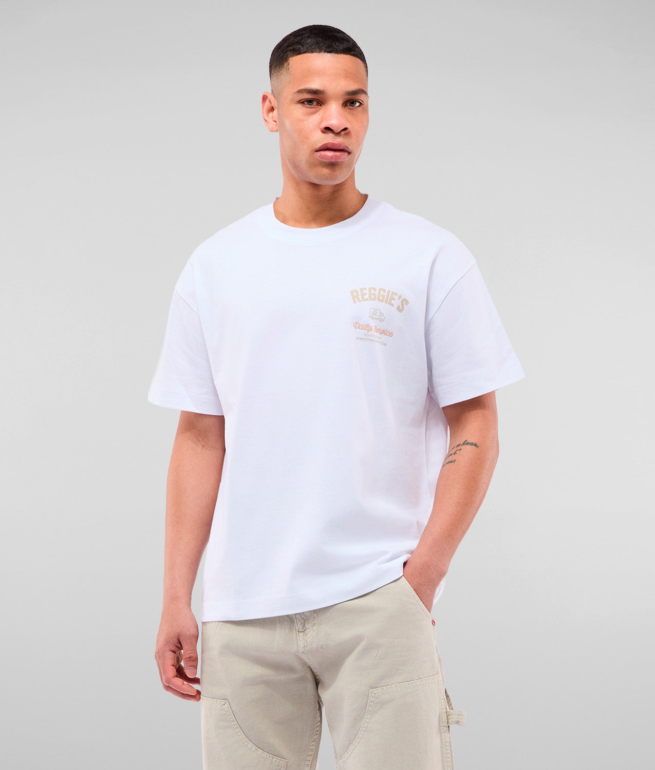 T-shirt in 100% cotone tinto in capo, morbida e traspirante, con un fit loose che garantisce massimo comfort e un look giovane e contemporaneo. Realizzata in tessuto da 220 GSM, assicura una vestibilità strutturata e piacevole al tatto. Il design si distingue per la grafica "Reggie's Daily Service" ispirata alle locandine storiche, applicata sul petto, e per la maxi-stampa sul retro, che aggiunge un tocco distintivo e urban. Perfetta per chi ama un outfit casual dal carattere unico.