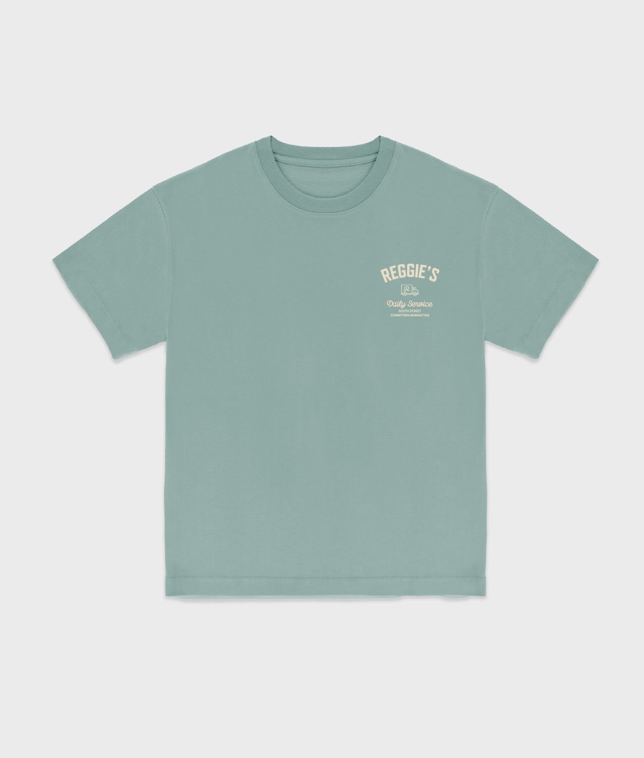 T-shirt in 100% cotone tinto in capo, morbida e traspirante, con un fit loose che garantisce massimo comfort e un look giovane e contemporaneo. Realizzata in tessuto da 220 GSM, assicura una vestibilità strutturata e piacevole al tatto. Il design si distingue per la grafica "Reggie's Daily Service" ispirata alle locandine storiche, applicata sul petto, e per la maxi-stampa sul retro, che aggiunge un tocco distintivo e urban. Perfetta per chi ama un outfit casual dal carattere unico.