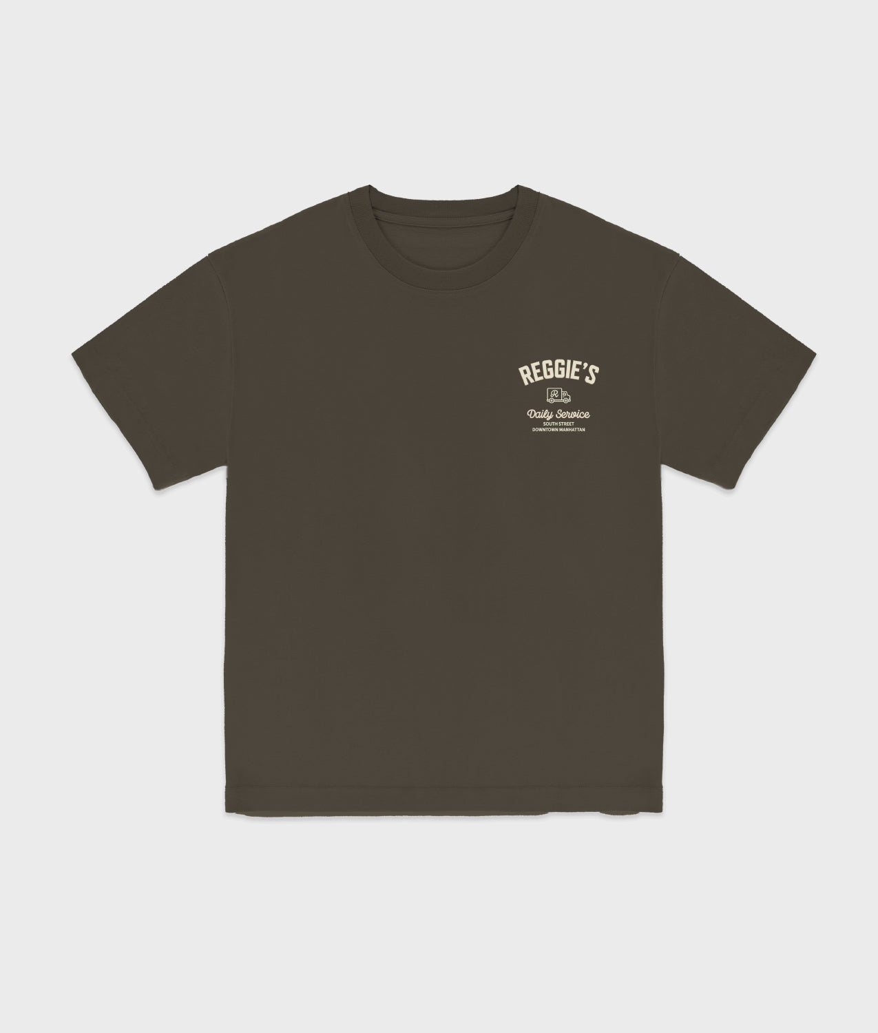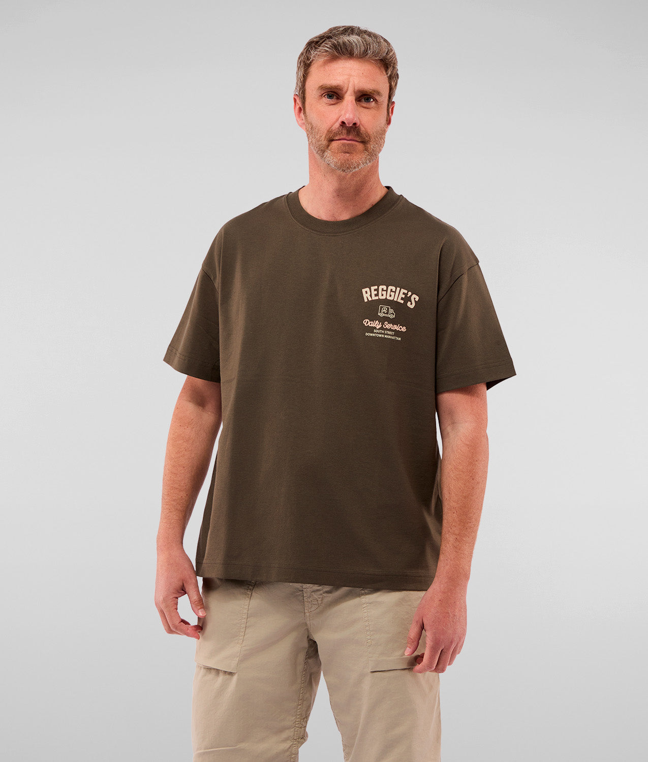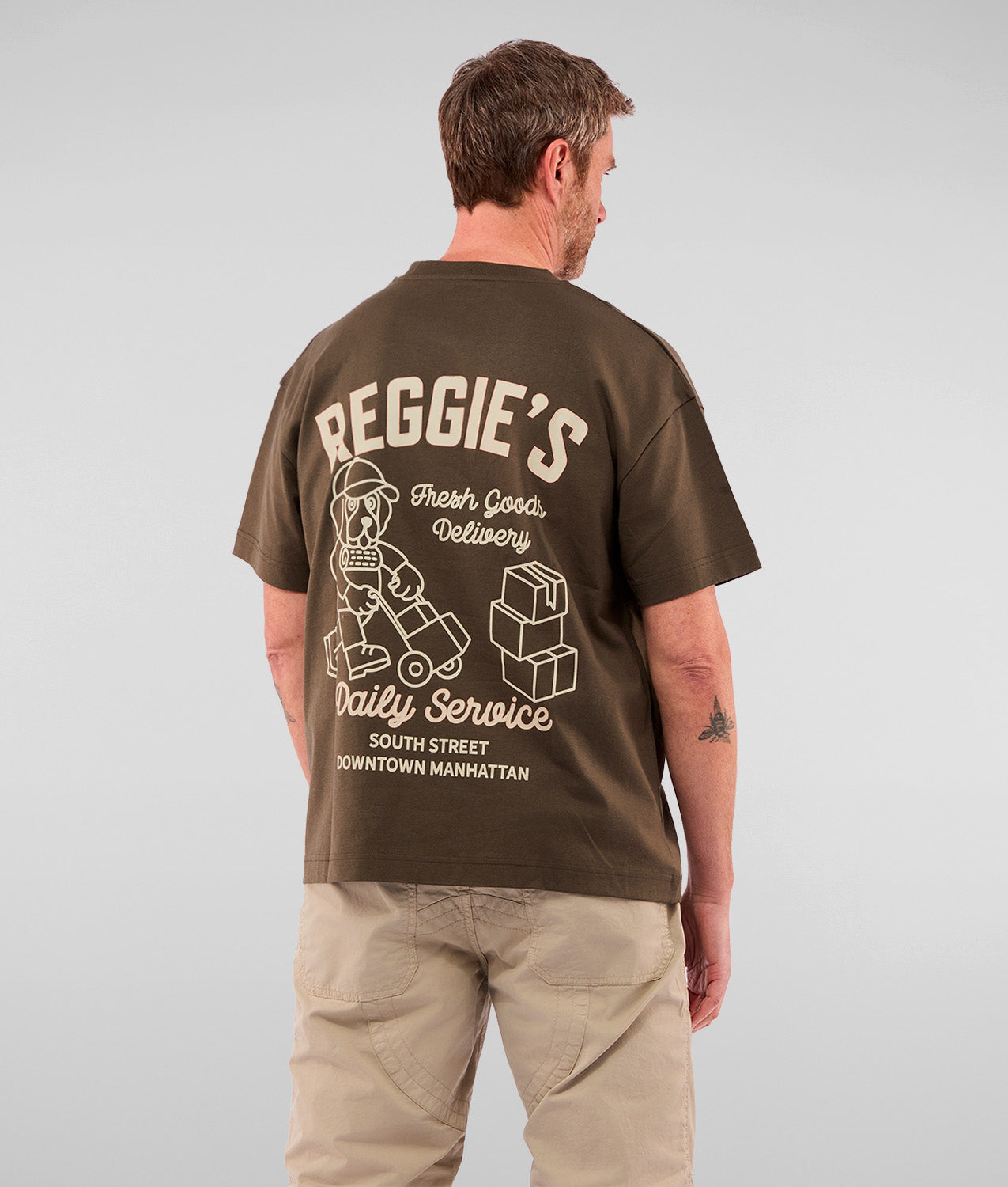 T-shirt in 100% cotone tinto in capo, morbida e traspirante, con un fit loose che garantisce massimo comfort e un look giovane e contemporaneo. Realizzata in tessuto da 220 GSM, assicura una vestibilità strutturata e piacevole al tatto. Il design si distingue per la grafica "Reggie's Daily Service" ispirata alle locandine storiche, applicata sul petto, e per la maxi-stampa sul retro, che aggiunge un tocco distintivo e urban. Perfetta per chi ama un outfit casual dal carattere unico.