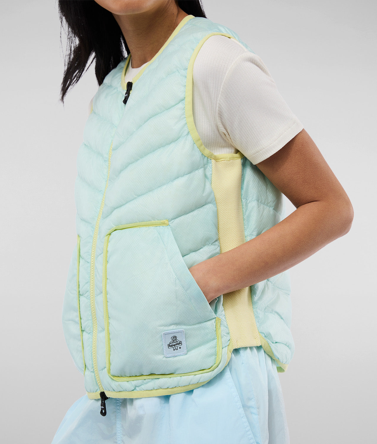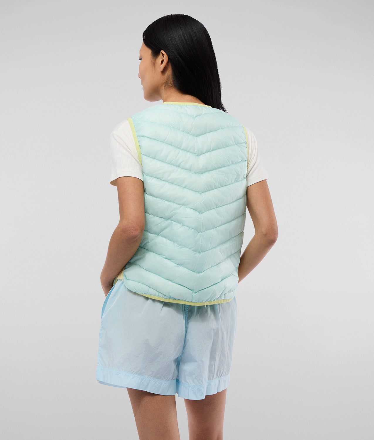 Piumino smanicato da donna dal look giovane e dinamico, perfetto per un utilizzo quotidiano. Ultra-leggero e confortevole, è imbottito al 100% in piuma 90-10 RDS, garantendo morbidezza, termo-regolazione e traspirabilità, oltre a una vestibilità pratica e maneggevole. La vestibilità comoda e i dettagli a contrasto aggiungono un tocco di stile, rendendolo un capo versatile e funzionale, perfetto per affrontare la stagione con comfort e praticità. Il design packable permette di richiuderlo su sé stesso all’interno di una tasca, rendendolo il compagno ideale di viaggio o per ogni occasione.